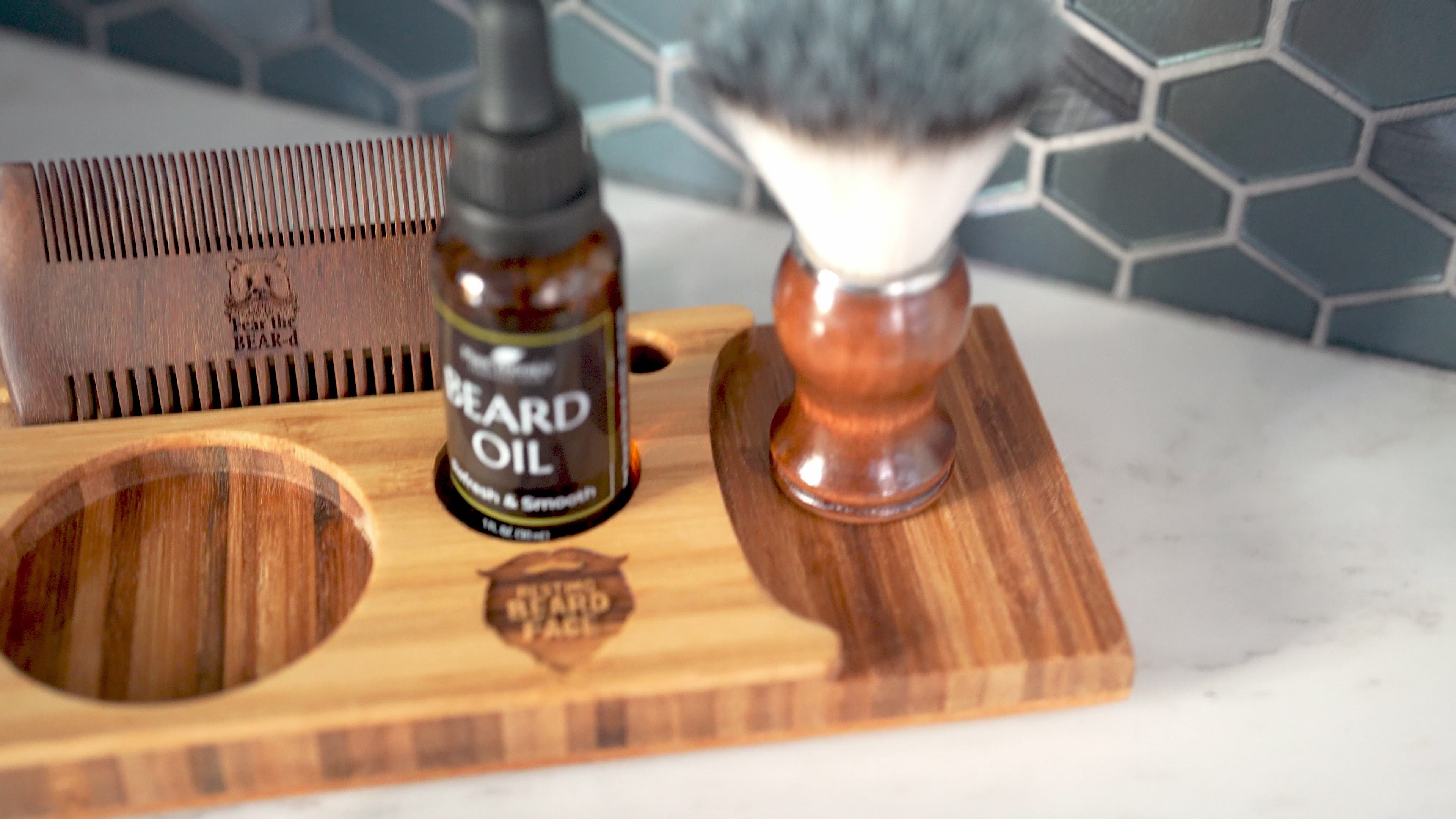 The caddy features a slot for your beard comb, brush, blade, beard balm tin, and oil bottle.