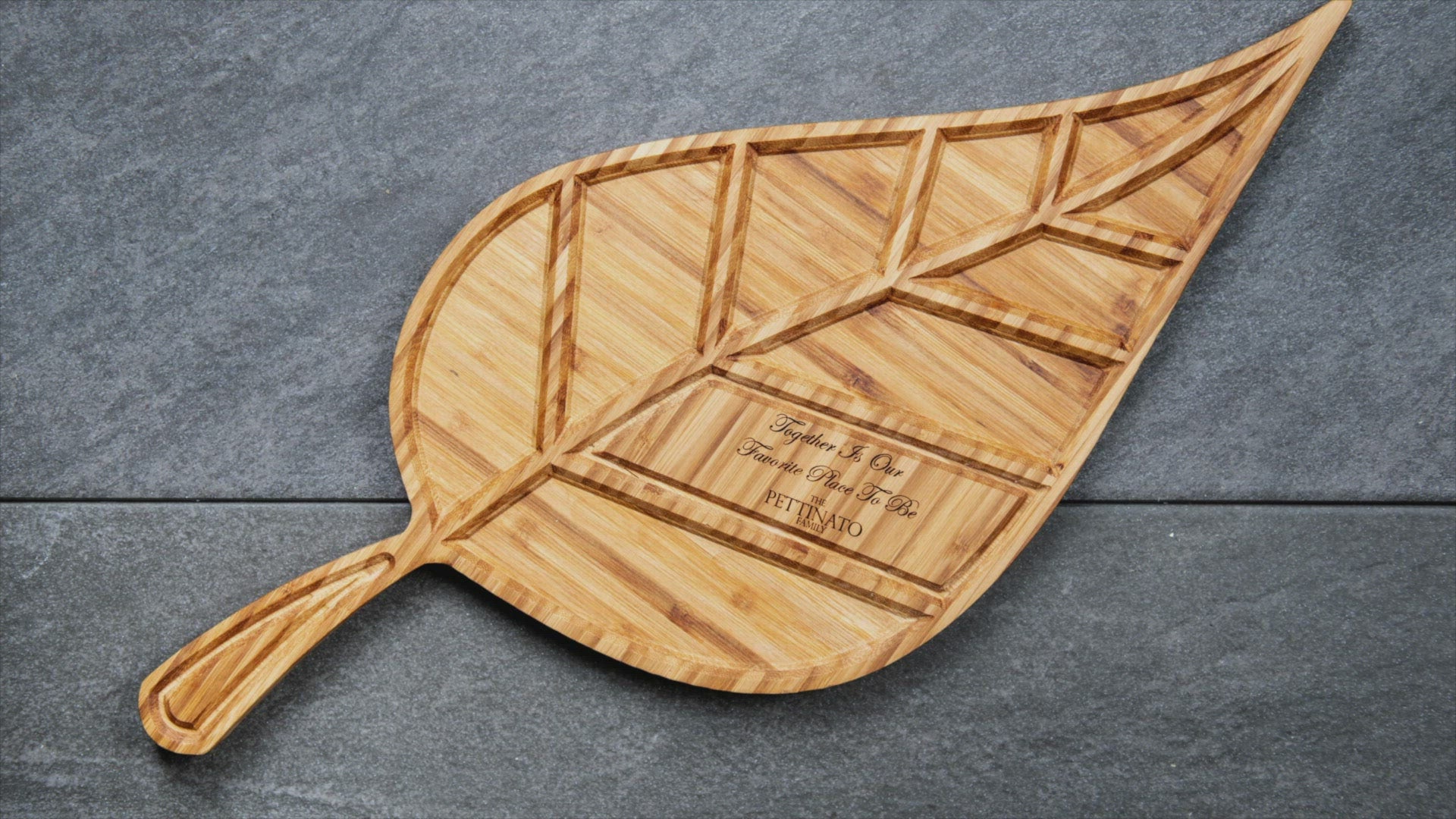 Available in Amber or Espresso wood, this striking plank is made only by us at Left Coast Original. Available in a Small Leaf Plank, a Large Leaf Plank, and an optional Leaf Stand that can also be bundled with our gift sets. Flip our Charcuterie Leaf Planks over to use it as a functional Cutting Board.