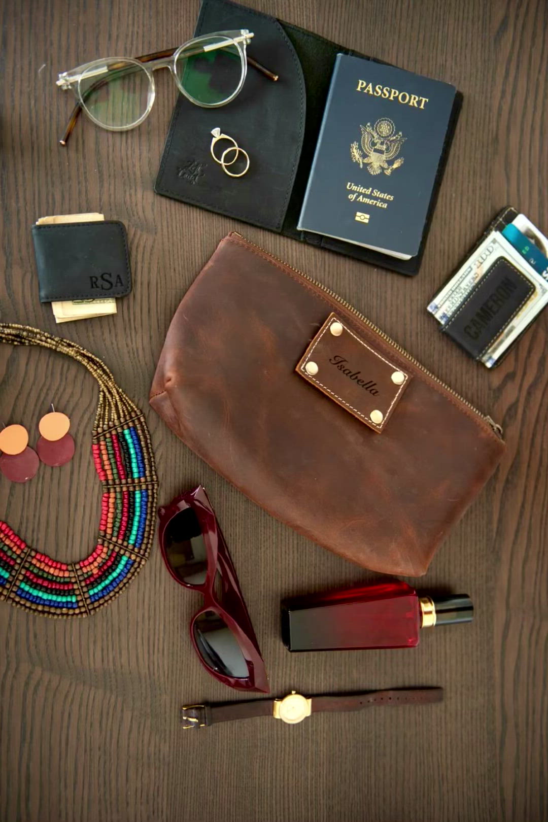 Our chic and simple Toiletry Bag features a personalized engravable leather plaquette and a large open interior.