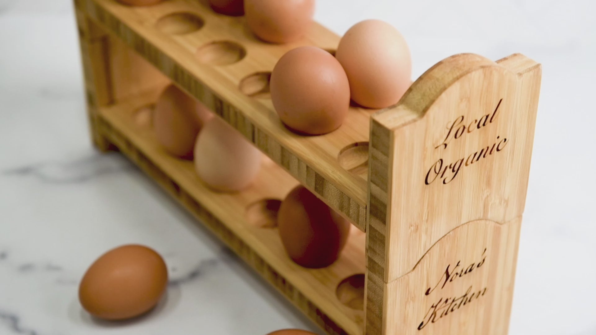 Left Coast Original egg trays are stackable, hold a dozen eggs per tray, and can be cleaned easily. Our sustainably sourced bamboo engraves beautifully, prevents bacterial growth, and manages moisture better than unfinished woods.