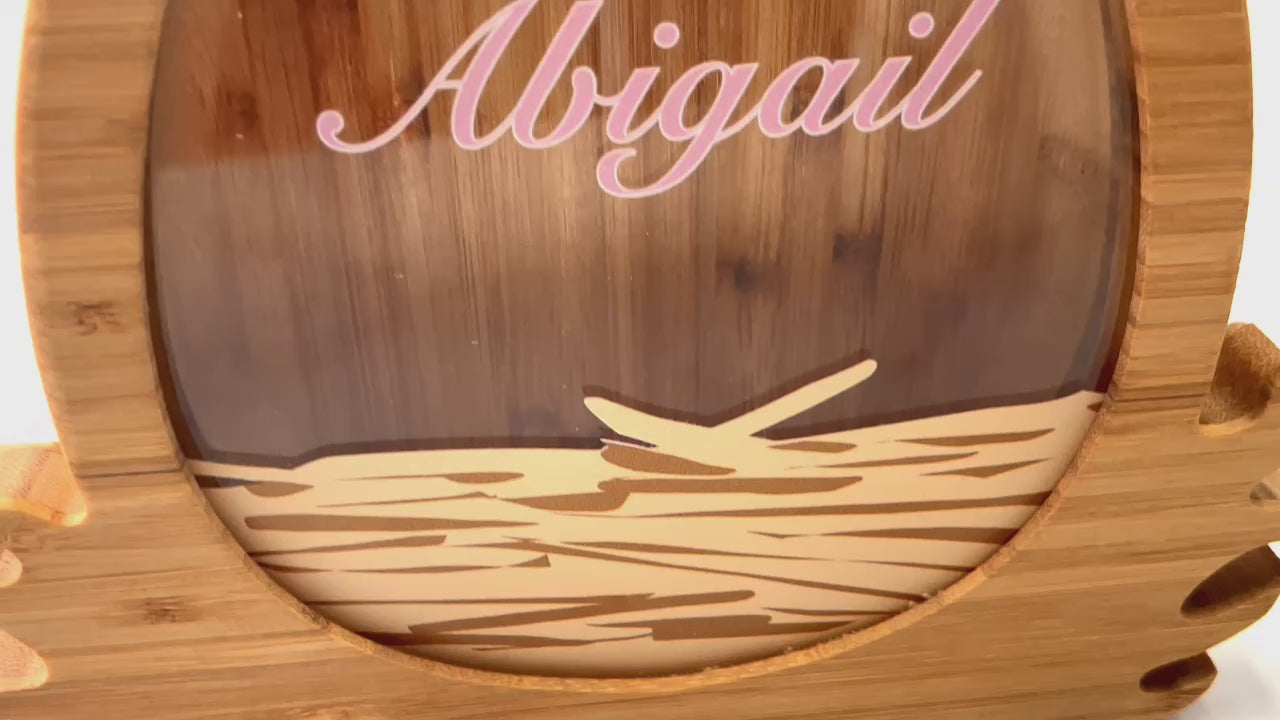 A fun way for your child to save and a perfect compliment to their room’s décor, our Egg Nest Shaped Bank is a fun and practical gift. Further personalize your bank to match your kiddo’s unique style by choosing from 10 font options, 5 colors, and 4 designs. Each bank is carved from an attractive and sturdy wood and topped with a securely fastened acrylic cover. Each bank is about 8.5in tall, 9in wide at the base, and 1.3in. thick.