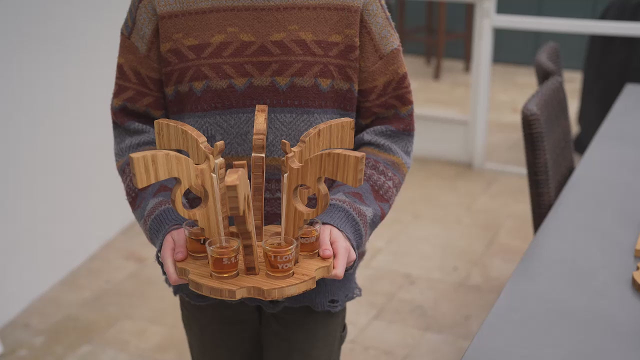 Six Shooter Shot Board is designed with care and intention in the shape of a classic six-shooter ammo cylinder. Load up the board with “shots” of your favorite spirit. Board comes with six bamboo rubber band shooters that display as an awesome bar decoration and are nested loose enough for a quickdraw for a rubber band duel, perfect for parties, game nights, or adding a rustic charm to any home bar. This board has undeniable style and functions perfectly as an unforgettable experience for guests.