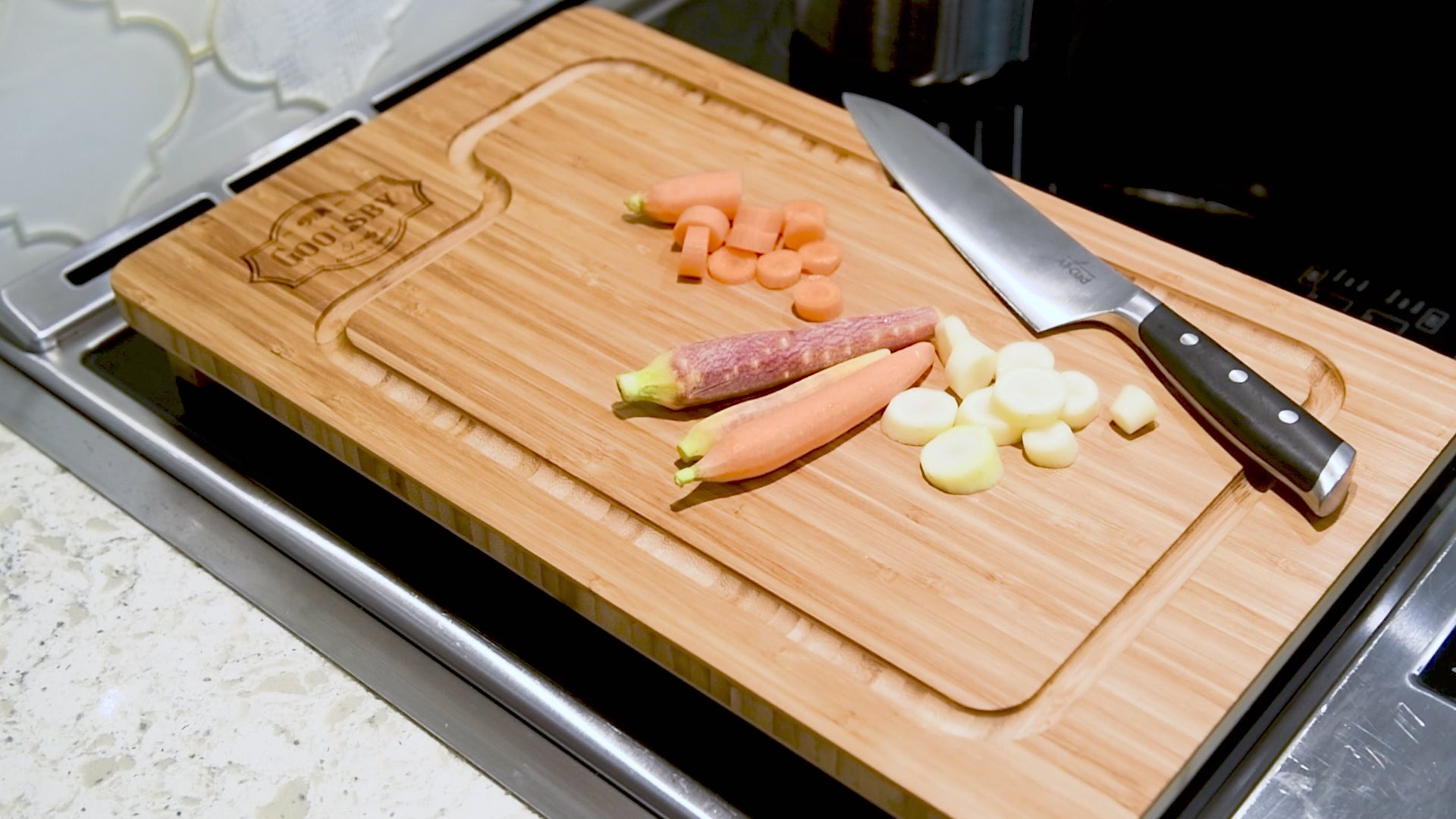 Ask any home chef, and they’ll tell you that the key to culinary success is squeezing every bit of value out of your counter space. But why stop there? Put that neglected stovetop to work too. With this clever cutting board, you can turn those unused burners into prime food-prep real estate. It’s also laser-engraved, so everyone knows who’s behind your kitchen’s magic.